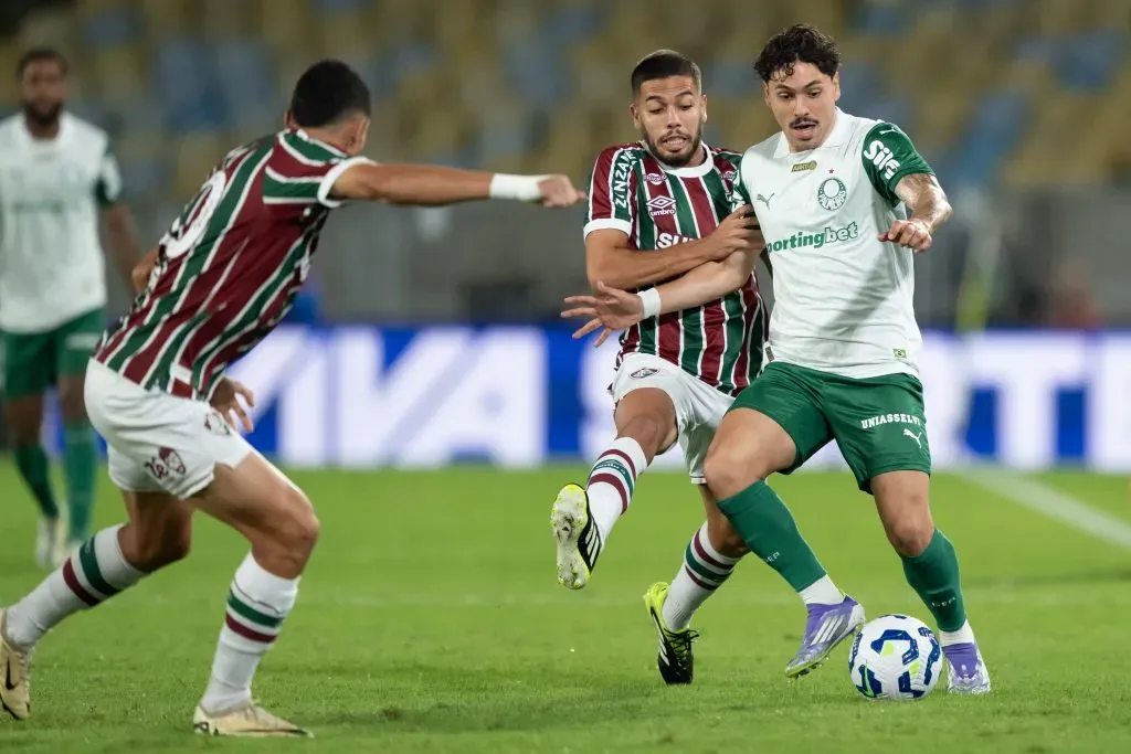 Nonato jogador do Fluminense disputa lance com Mauricio jogador do Palmeiras durante partida no estadio Maracana pelo campeonato Brasileiro A 2025. Foto: Jorge Rodrigues/AGIF