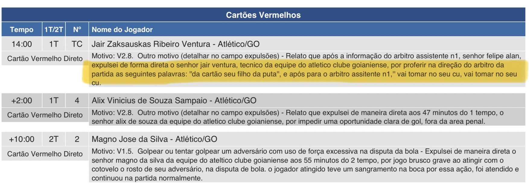 Na súmula, André Luiz Policarpo Bento relatou que expulsou atleta de forma direta por “impedir impedir uma oportunidade clara de gol, fora da área penal”.