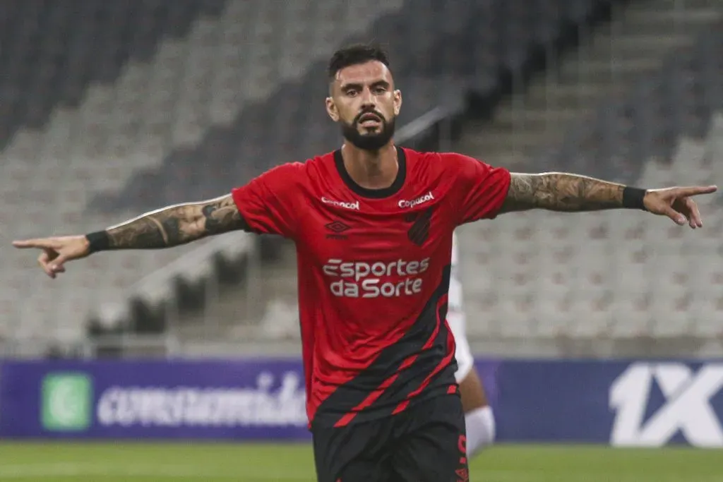 Mastriani jogador do Athletico-PR comemora seu gol durante partida contra o PSTC na Arena da Baixada pelo campeonato Paranaense 2024. Foto: Gabriel Machado/AGIF