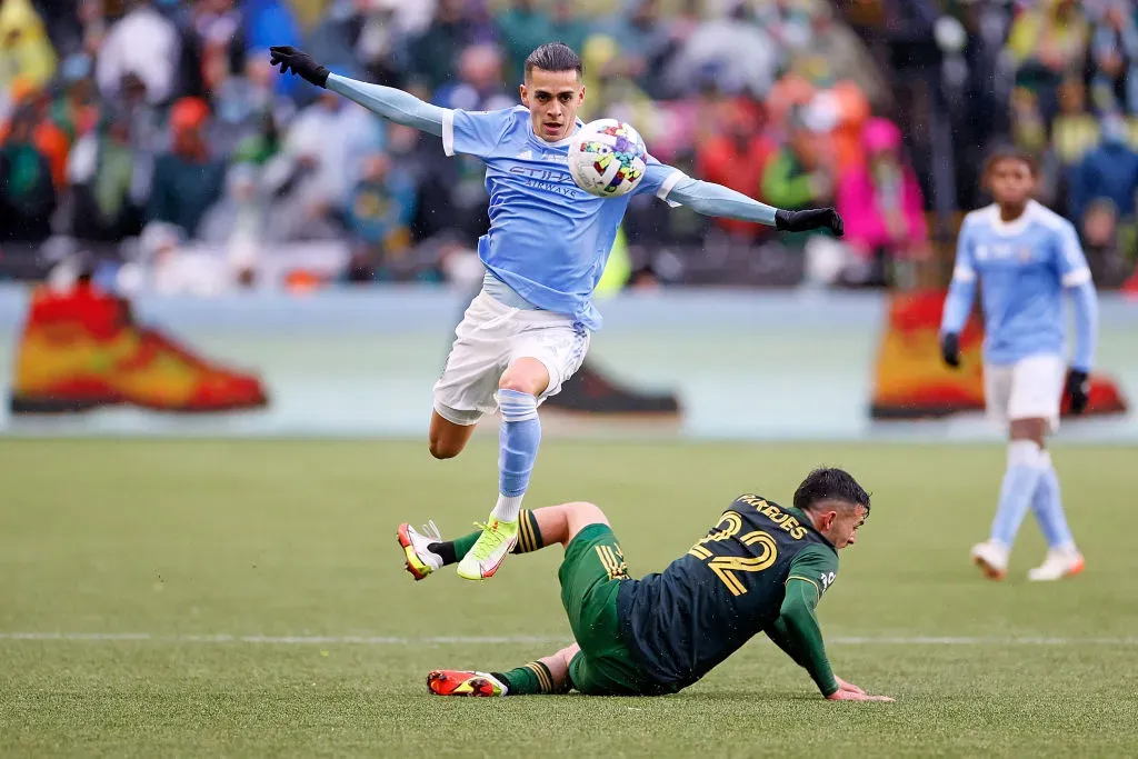 PORTLAND, OREGON – DECEMBER 11: Jesus Medina #19 of New York City jumps over Cristhian Paredes #22 of Portland Timbers while dribbling downfield during the second half of the 2021 MLS Cup final at Providence Park on December 11, 2021 in Portland, Oregon. (Photo by Steph Chambers/Getty Images)