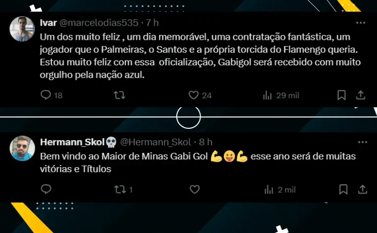 “Um dia muito feliz, um dia memorável, uma contratação fantástica, um jogador que o Palmeiras, o Santos e a própria torcida do Flamengo queria. Estou muito feliz com essa oficialização, Gabigol será recebido com muito orgulho pela nação azul”, disse um usuário do X (antigo Twitter).