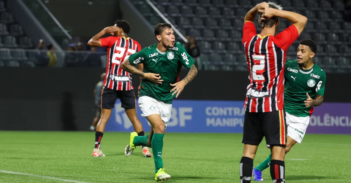 [[{“value”:”Por Eduardo Luiz24/02/2026, 00h13 Jogando em Barueri na noite de segunda-feira o Palmeiras empatou em 3 a 3 com o São Paulo pela segunda rodada do Brasileirão Sub-20. Os gols do Verdão foram anotados por Antônio Marcos, Heittor e Erick Belé. O time do técnico Lucas Andrade ficou por duas vezes com 2 gols de