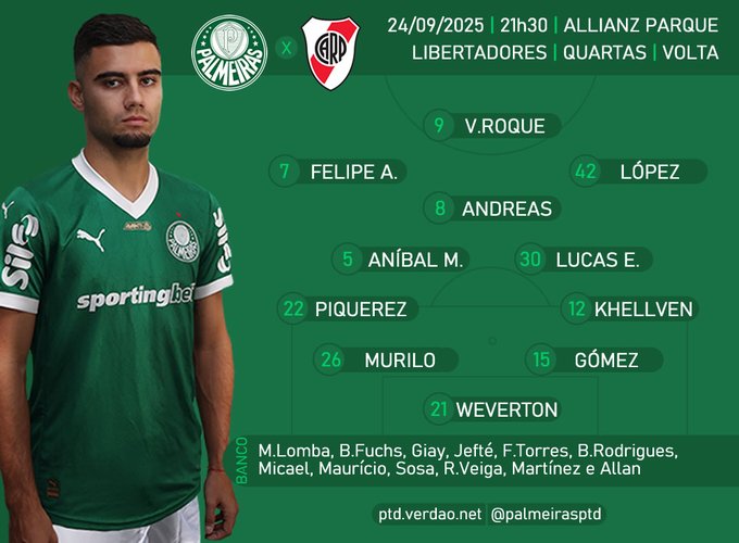 [[{“value”:”Por Eduardo Luiz24/09/2025, 20h34 Ficha técnica: Palmeiras: Weverton; Khellven, Gómez, Murilo e Piquerez; Aníbal Moreno, Lucas Evangelista e Andreas Pereira; López, Felipe Anderson e Vitor Roque.Técnico: Abel Ferreira River Plate: Armani; Montiel, Rivero e Paulo Díaz; Portillo, Acuña, Enzo Pérez e Nacho Fernández; Castaño, Salas e BorjaTécnico: Marcelo Gallardo Local: Allianz Parque, São Paulo (SP)Data:
