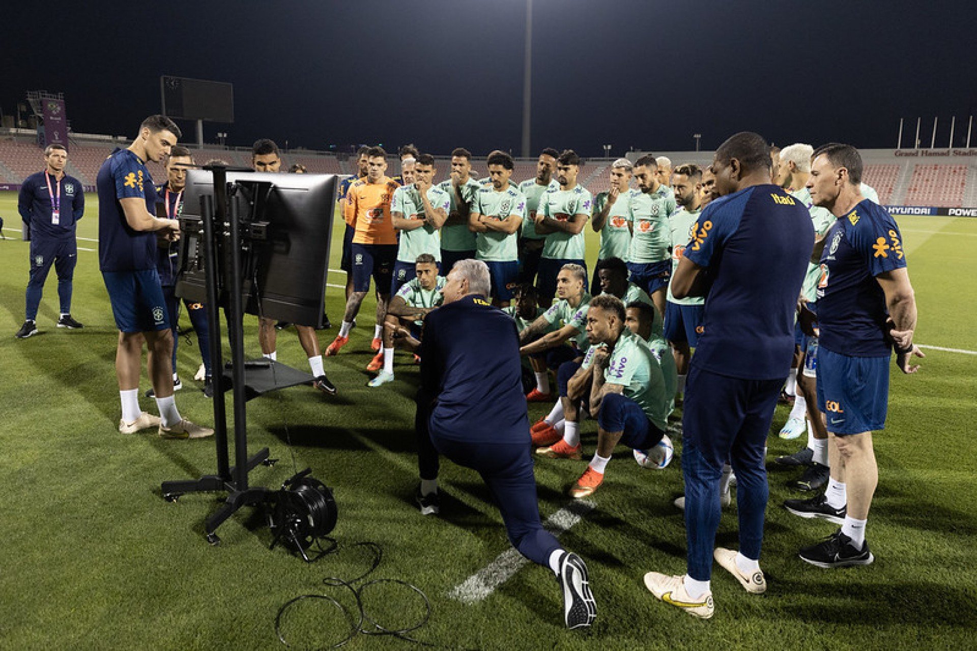 Nesse período, de acordo com o “ge”, a comissão técnica colocou faixas em campo para trabalho de campo reduzido. Além disso, Tite levou um monitor ao gramado para orientar os atletas.